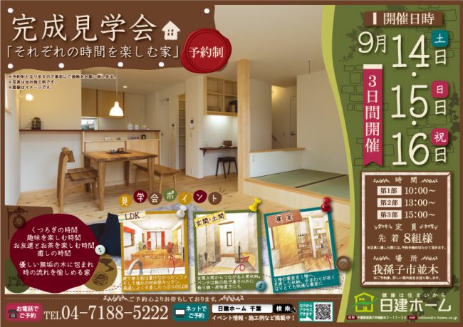 9月14日(土)・15日(日)・16(祝)「それぞれの時間を楽しむ家」完成見学会