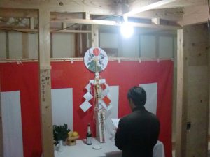 初めに工事の安全と建主様の幸せを神様にお願いする祝詞を大工の金子棟梁が読み上げます。