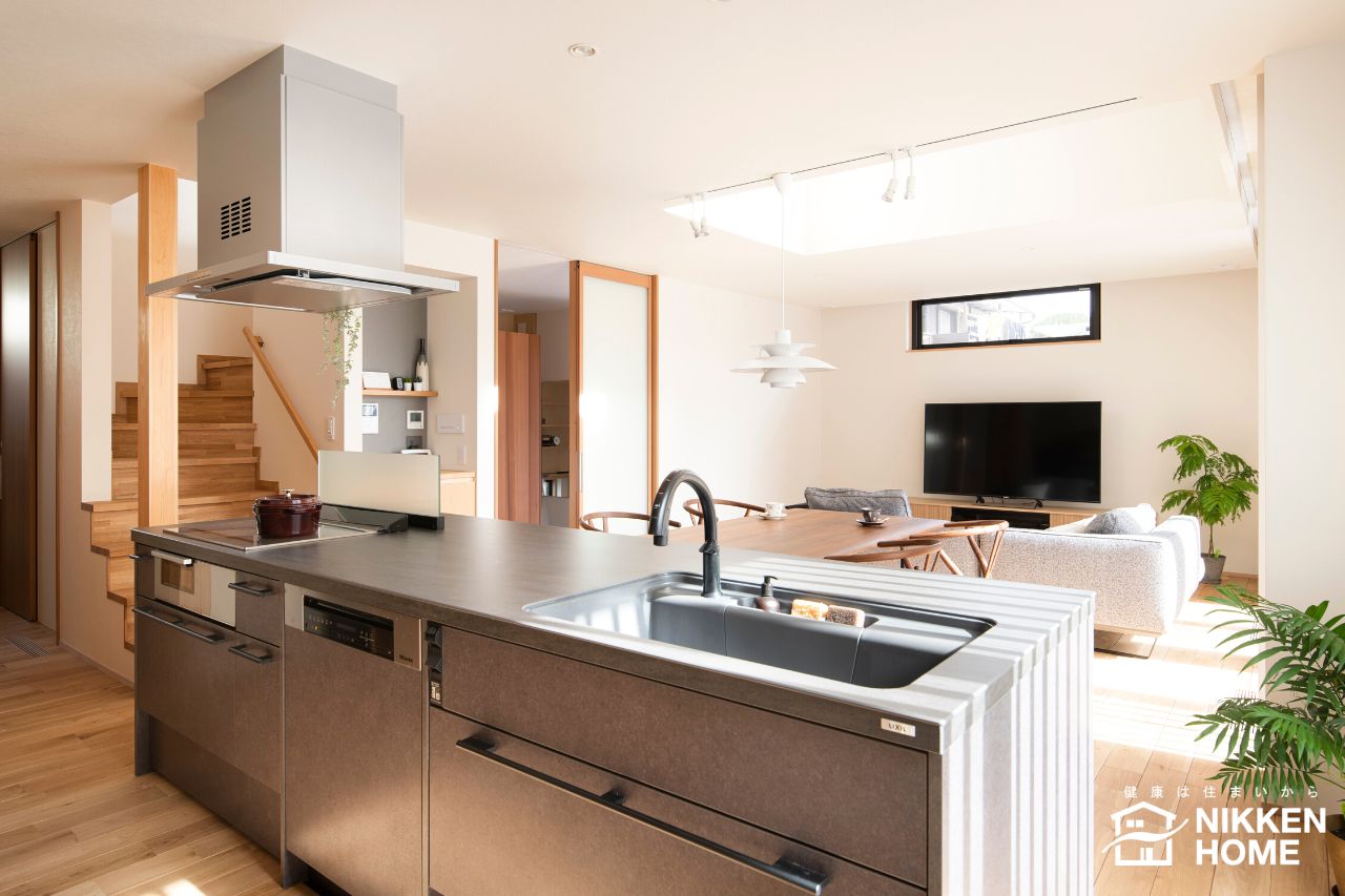 重厚感のある濃いグレーのキッチンは空間の主役にもなっています。
