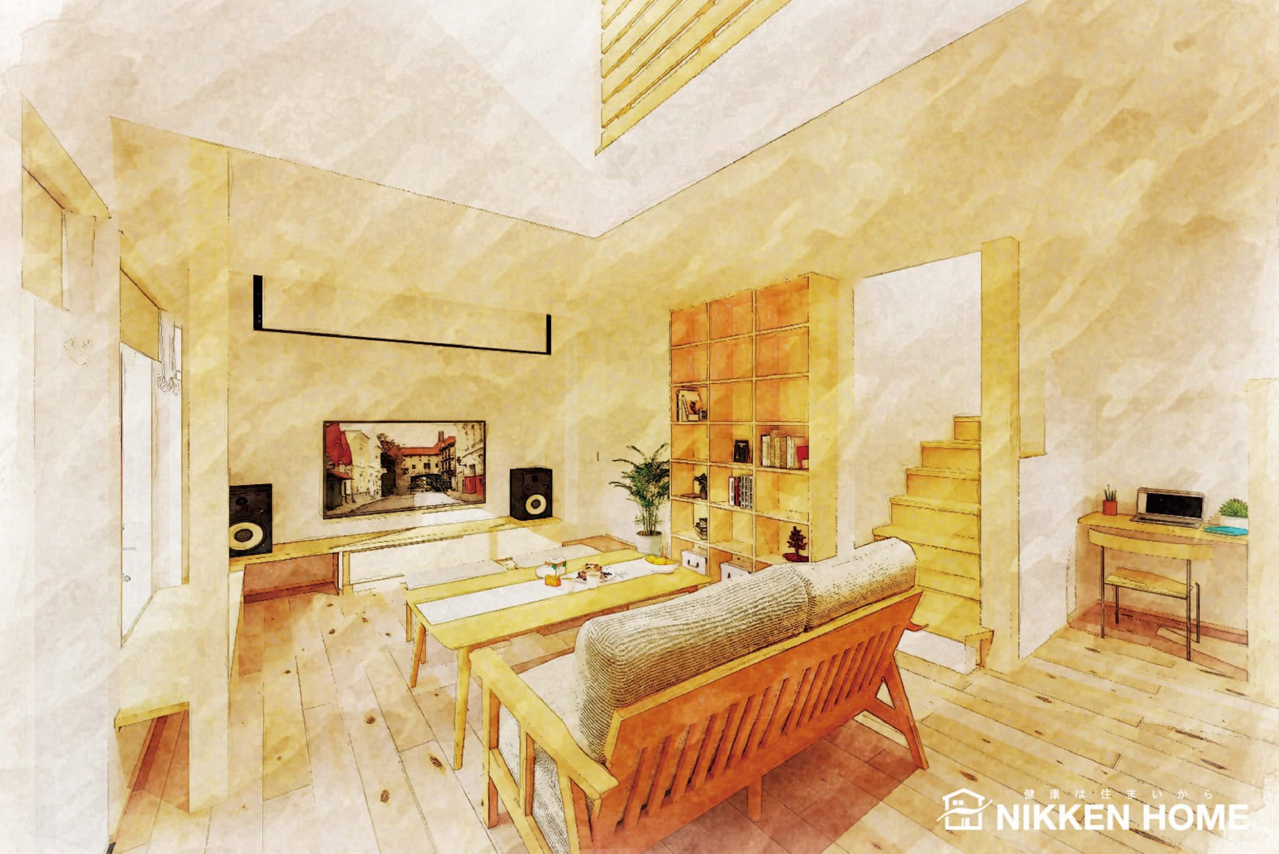 床は『あづみの松』、壁は『珪藻土』など自然素材を採用しています。大画面のプロジェクタースクリーンで映画や動画を楽しんだり、小上がりの和室でゆったりとお庭を眺めたり素敵なお家が完成予定です。