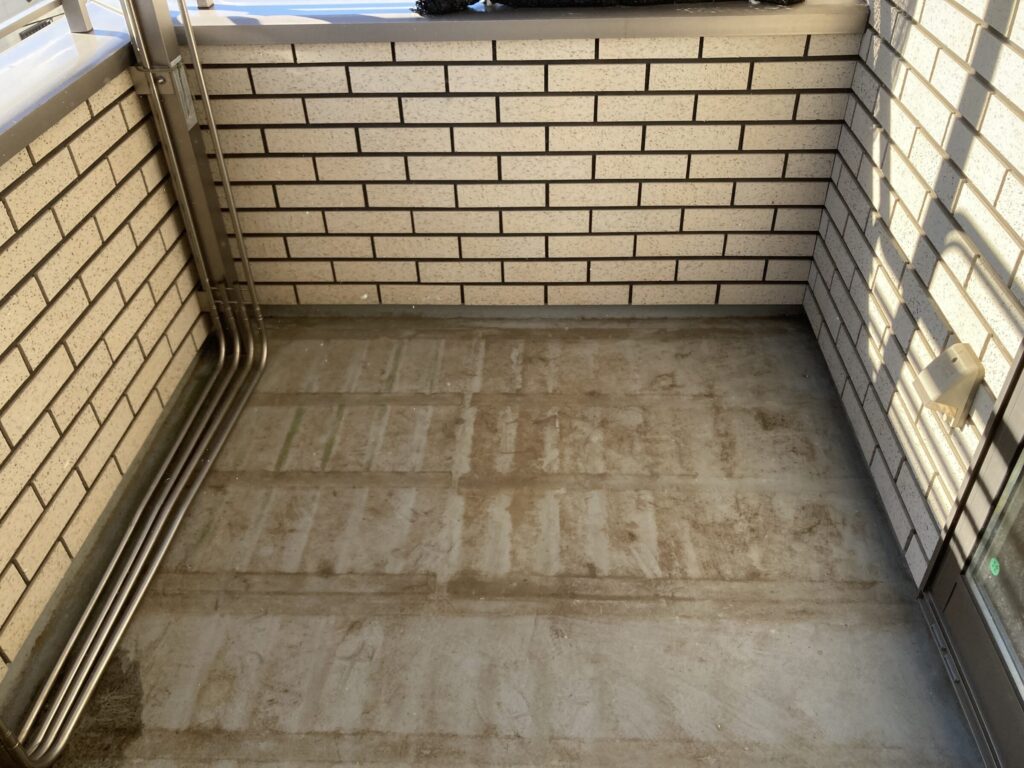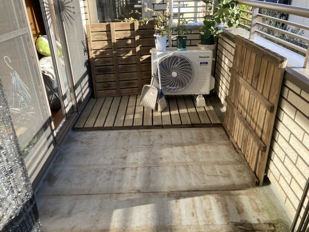 ベランダには木製のスノコが敷いてあり、洗濯物干場としての用途の他にエアコン室外機や趣味の3段のフラワースタンドがスノコの上に載っており、そう簡単には掃除できません。一年以上ぶりに重いスノコを持ち上げると、想像以上に隙間から入り込んだゴミや植木鉢からこぼれた土がFRP床面にいっぱい溜まっていました。