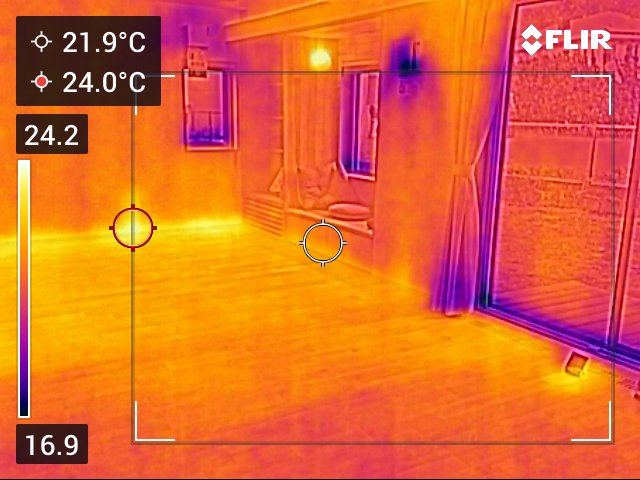 1台目の床下エアコンがあるLDKは床全体が黄色く赤丸の所は24度あります。