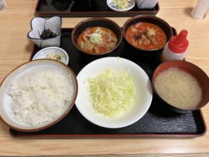 人気の普通のもつ煮とピリ辛もつ煮の『ハーフ&ハーフ定食』とご飯の上に