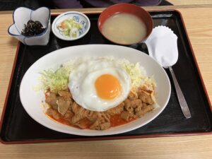 千切りキャベツとピリ辛もつ煮と目玉焼きが乗った『ゴヂライス』を注文。