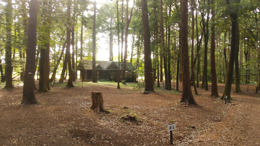 自然豊かな木々の中にアスレチック広場、キャンプ場、恐竜の滑り台、じゃぶじゃぶ池