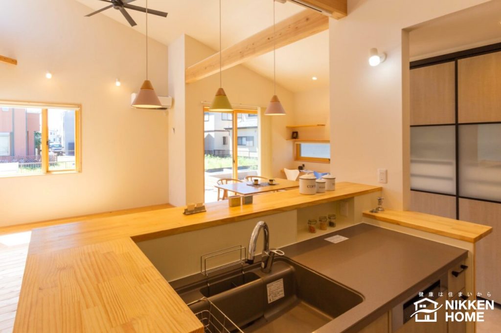 料理中の手元を隠したい方には、程よい高さの造作カウンターも設置できます。