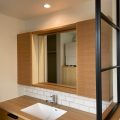 鉄骨フレームのガラス仕切りがポイントの大きな洗面台