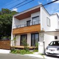 板張りのバルコニーと緑が調和する外観