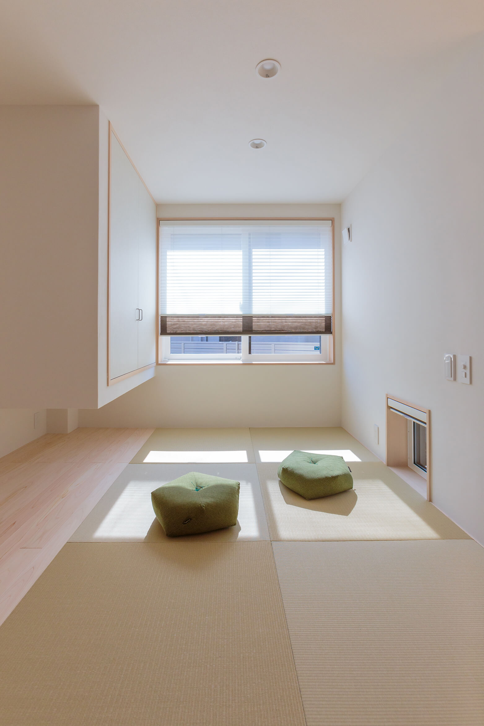オーク材の美しい無垢の床、水回りはお手入れのしやすいフロアタイルに